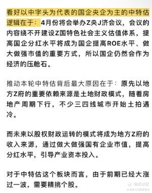 中特估的话,整体逻辑4月份的文章(A股一季度总结,4月份看好的方向,见下图)提过。但目前的话,中特估概念的行情短暂性也要休息盘整一段时间了。