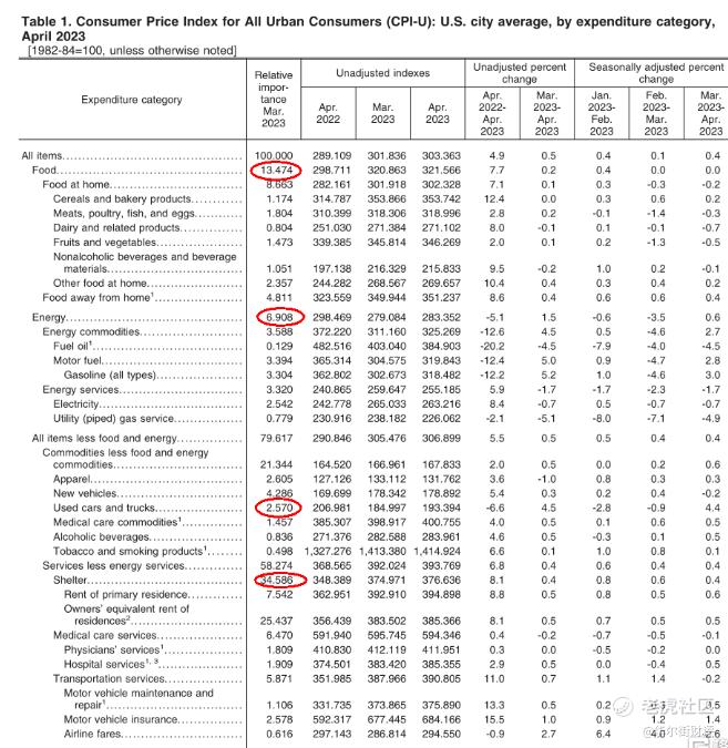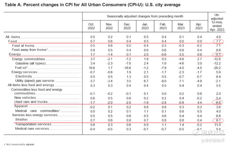 此次《CPI子项》中,美国4月未季调食品通胀年率 7.7%,低于前值8.5%。能源通胀年率 -5.1%,略高于前值-6.4%。二手车和卡车通胀年率 -6.6%,略高于前值-11.2%。住房通胀年率 8.1%,略低于前值8.2%。