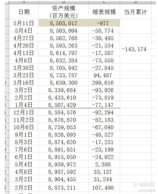 就业与通胀是美联储的政策双目标,现在就业边际变差,通胀上涨边际放缓,那么6月份很有大可能是会暂停加息的。接下来看下《每周缩表规模》: