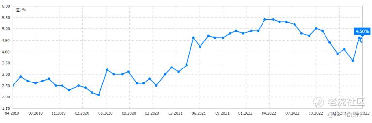 美国<密歇根大学统计>的一年期通胀预期值为4.5%,略低于前值4.6%,但高于预期4.4%。