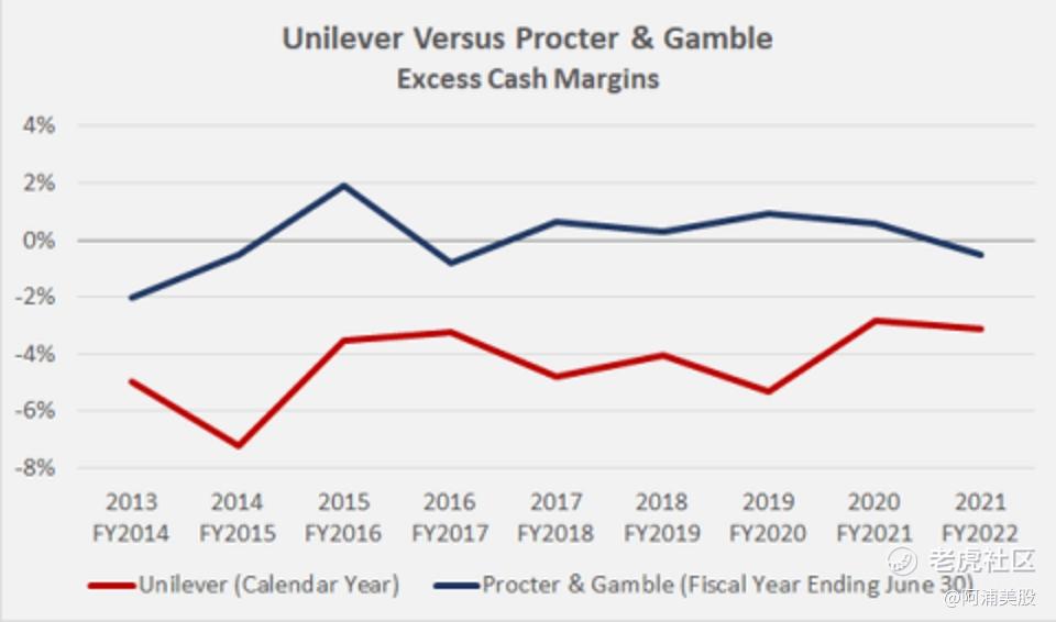 图 9:联合利华和宝洁的超额现金保证金轨迹;营业收入针对减值和重组费用进行了调整,营业现金流量针对基于股份的补偿进行了调整,并根据营运资金流动进行了标准化(基于两家公司过去九年的现金流量表)