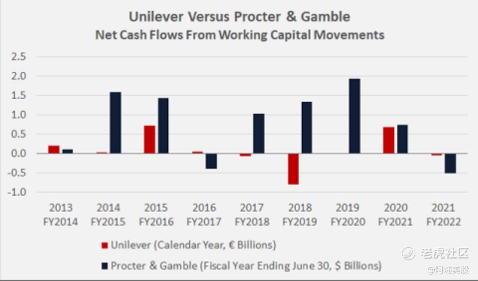 图 1:2013 年至 2021 年(联合利华)以及 2014 财年和 2022 财年(宝洁)的营运资本流动产生的净现金流量(基于两家公司过去九年的现金流量表)