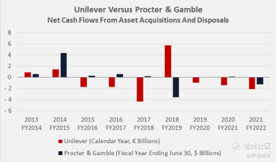 图 2:2013 年至 2021 年(联合利华)以及 2014 财年和 2022 财年(宝洁)资产收购和处置产生的净现金流量(基于两家公司过去九年的现金流量表)