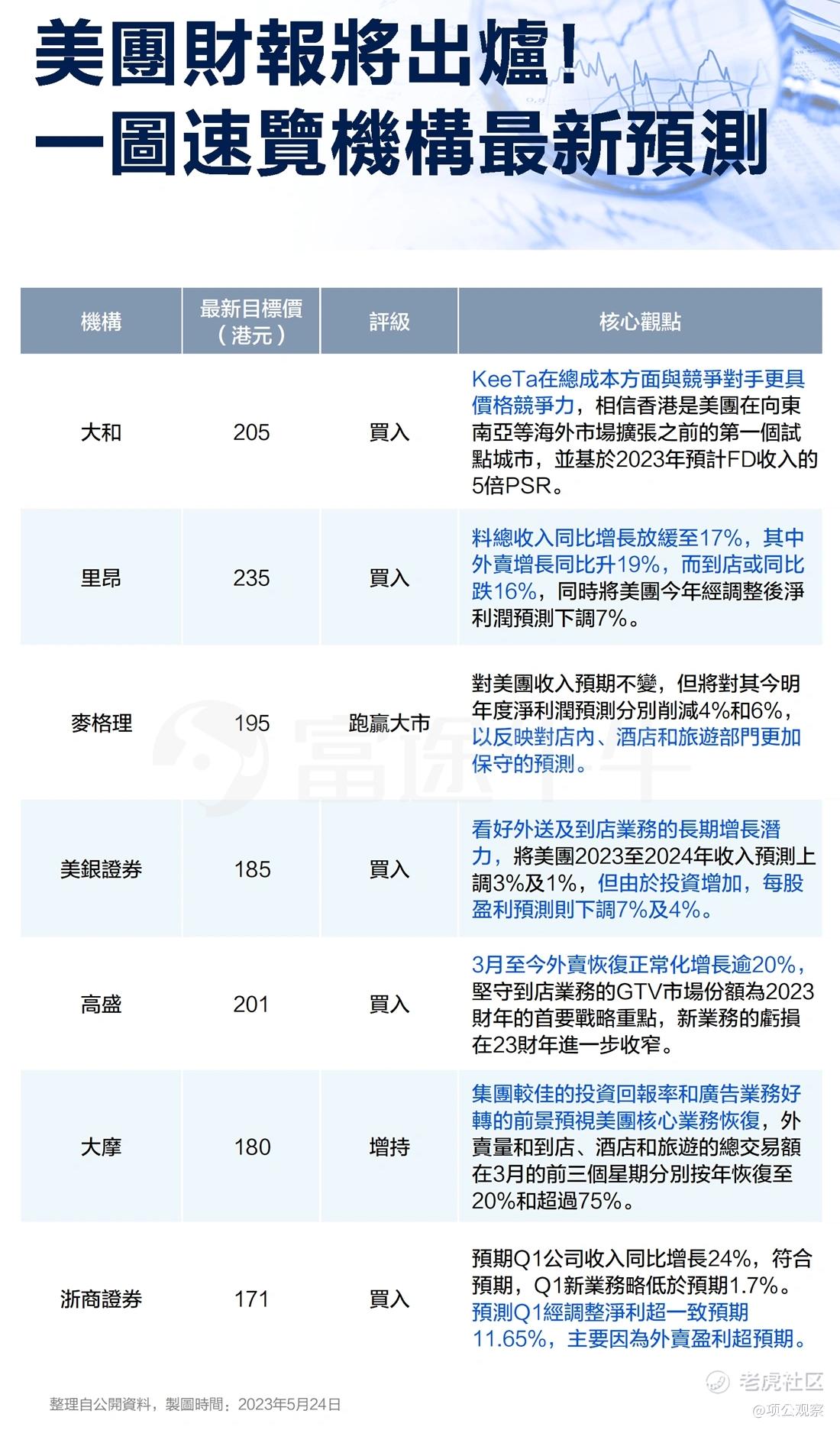$美团-W(03690)$ 将于今日(5月24日)发布2023年Q1季报。据彭博分析师综合预期,美团2023年Q1营收为574.82亿人民币,同比增24.2%;调整后净利润为19.34亿人民币。