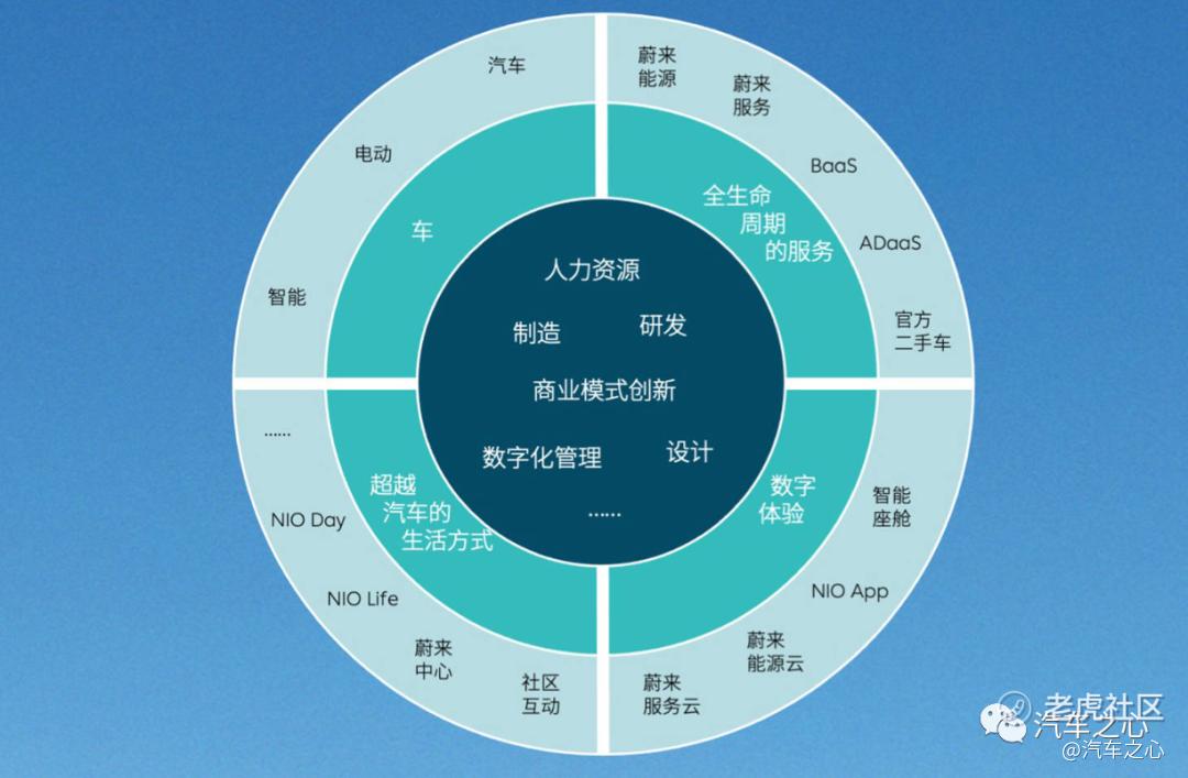 圆心是蔚来的战略、商业模式和核心能力,代表蔚来的初心,从内向外细分,内容可以不断被细化,这也是自 2014 年蔚来创立就定下的长期目标。