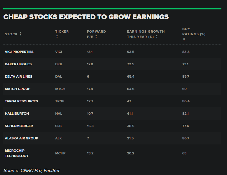 CNBC Pro使用FactSet数据,筛选出比标普500指数更便宜、受华尔街喜爱、预计本周公布的财报中盈利增长的股票。下表中的每支股票都符合以下标准: