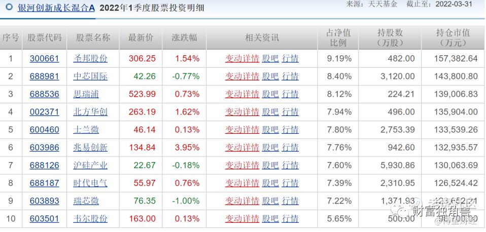 据2022年一季报显示,这只基金前十大重仓股变动不大,万业企业跌出前十大重仓股,减仓北方华创等,倒是新增兆易创新,加仓圣邦股份、瑞芯微,从重仓股来看,都是中大盘股,而且属于半导体板块中的龙头公司。从调仓的动作看,大致减仓半导体设备公司,加仓半导体设计类公司。