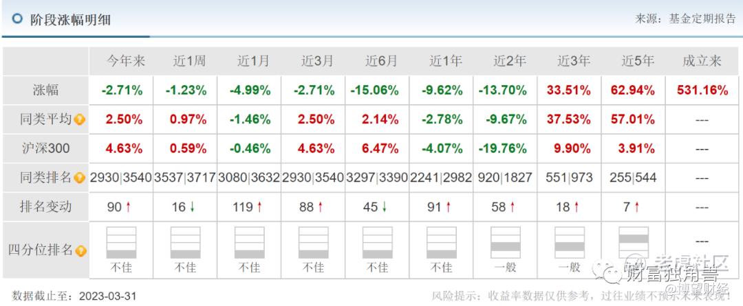 我们以跌幅较大的银河主题策略为例,据天天基金网显示,银河主题策略成立于2012年9月21日,基金经理为张杨,截至2022年12月31日基金规模为6.15亿元。截至3月24日,基金单位净值为5.3900。虽然近期该基金整体收益率为正,但近期业绩不太理想,近1月来收益率-4.99%,近6月来收益率-15.06%,近一年来收益率-9.62%,近2年来收益率-13.70%。