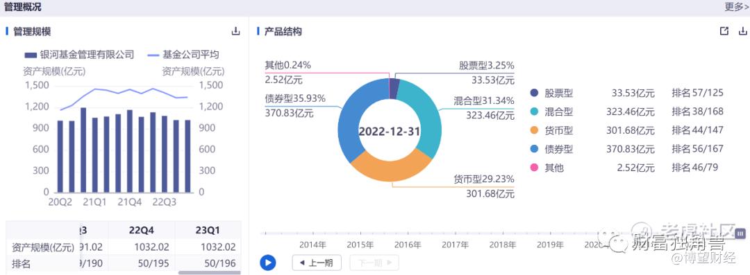 然而,2022年一季度非货币类基金却再次降至771.48亿元,而二季度又回升至837.63亿元,直到2022年四季度非货币基金却降至730.34亿元。据同花顺显示,2022年四季度银河基金公募总管理规模为1032.02亿元,相较于2021四季度下降了143.17亿元。
