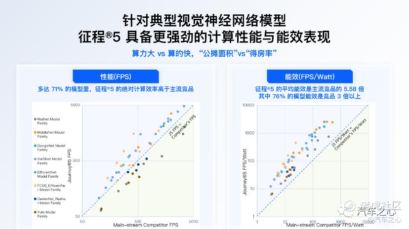 从数据中我们看到:地平线征程 5 真实计算效能已达 1531FPS(图像速率 1531 帧/秒),在典型分类模型下,征程 5 的计算性能和 Orin X 不相伯仲,但在处理单帧输入的百万像素大图时,达到了 Orin X 的 3.3 倍。