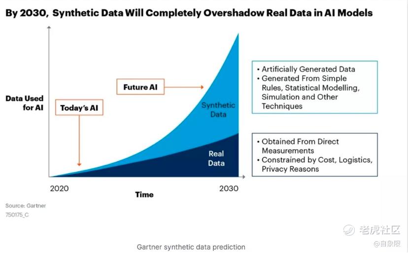 目前企业端已经在纷纷部署,这也导致合成数据数量正在以指数级的速度向上增长。Gartner研究认为,2030年,合成数据将远超真实数据体量,成为AI数据的主力军。