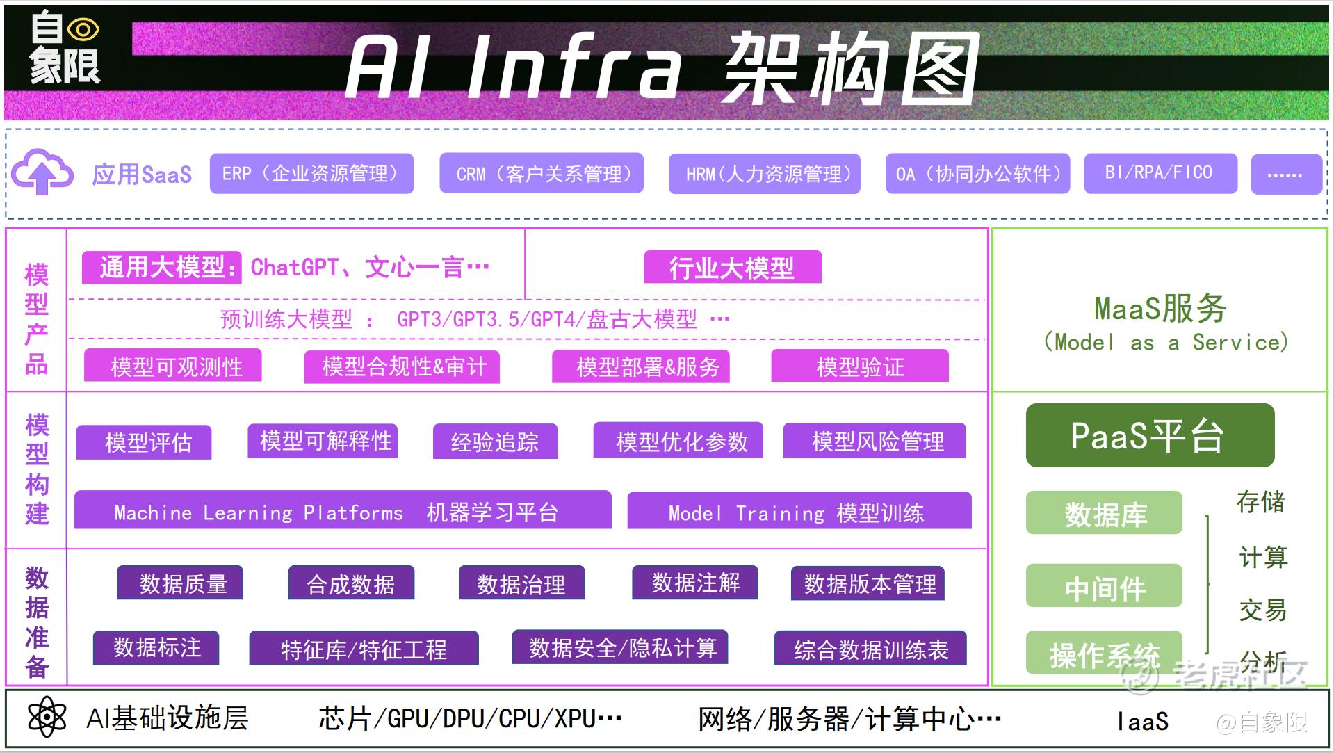 顺着大佬们的思路,「自象限」将AI Infra的链条进行了盘点和国内外公司对比以反观中国现状。简单来说,AI Infra 是一套十分复杂又基础的体系,包括构建、部署和维护人工智能 (AI) 系统所需的硬件、软件和服务的组合,它包括使AI算法能够处理大量数据、从数据中学习并生成有意义的见解或执行复杂任务的基本组件。