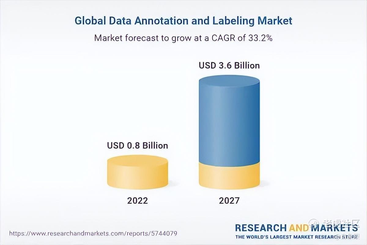 在AI产业链中,数据标注也占据了非常大比重,据AI分析公司Cognilytica的数据,数据标注环节的耗时占比可达25%。根据researchandmarkets的报告,全球数据注释和标签市场预计将从2022年的8亿美元增长到2027年的36亿美元,预测期内复合年增长率为 33.2%。