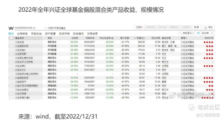 2022年,A股市场投资确实难做,沪深300指数全年跌幅20%,不少基金特别是权益类产品都出了回撤,规模大幅缩水。但谢治宇所在的兴证全球基金的混合型和股票型基金产品当年的收益率,确实不太好看。