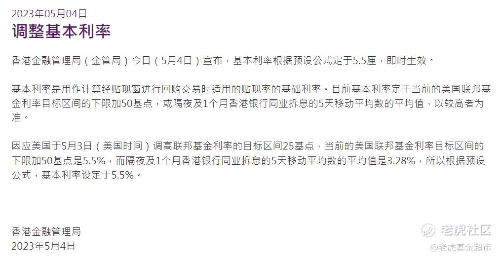 1)基准利率(Base rate):香港金管局贴现窗口提供的隔夜港元流动性贴现率。在联系汇率制度下,金管局放弃货币政策独立性,该基准利率紧跟美联储,一般高出联邦基金利率下限50bp。下图为今年5月4日跟随美联储加息,香港金管局发布的基准利率设定为5.5%的调整基本利率声明。
