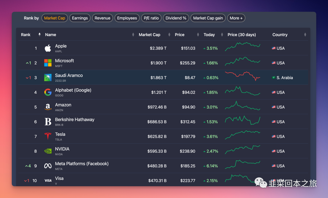 根据 CompaniesMarketCap 网站提供的数据,截至 2023 年 3 月 3 日,全球市值最大的 10 家公司有 9 家来自于美国。前 20 名,算是台积电 (11 名) 的话,也只有三个,另外两个分别是腾讯(13 名)和茅台(20 名)。