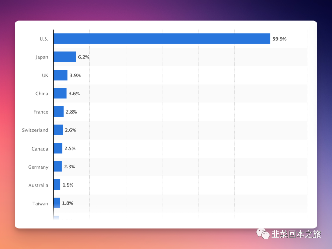 根据 Statista 提供的数据,截至 2022 年 1 月,全球最大股票市场的国家分布,按总世界股权市值占比划分。美股市场是世界上最大的股票市场,它的市值是全球股票市场的 60%(接近)。而中国股市的市值不到 4%,差距非常大。