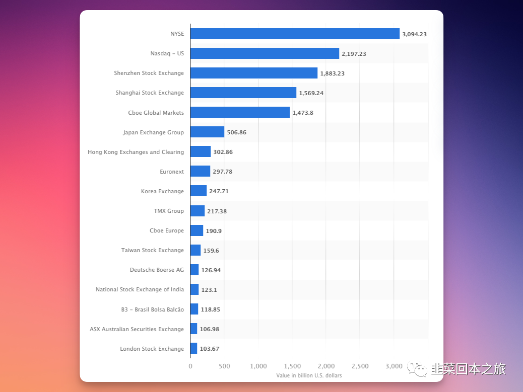 截至 2022 年 6 月,按电子订单股票交易的价值计算,全球最大的证券交易所排名。纽交所是全球最大的股票交易所,纳斯达克是全球第二大的股票交易所。