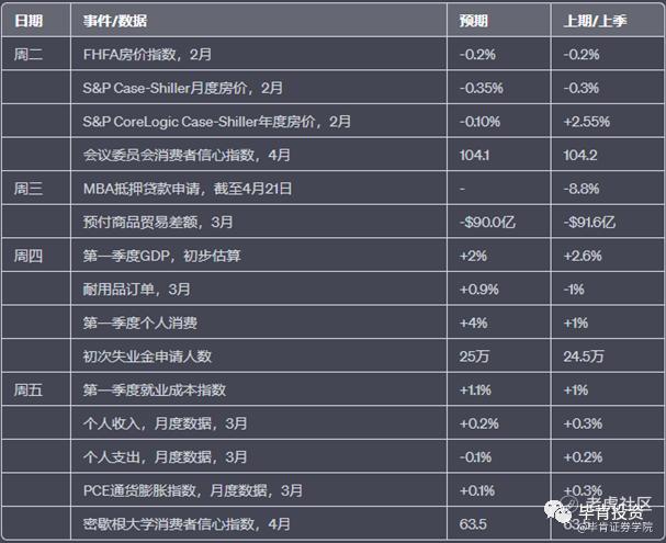 在接下来的一周,投资者将获得有关美国企业巨头年初业绩的更多数据,其中包括亚马逊(AMZN)、微软(MSFT)、Alphabet(GOOGL)和Meta Platforms(META)等科技巨头的季度业绩报告。此外,投资者还将密切关注周四发布的第一季度GDP的初步估计,预计显示美国经济在今年前三个月的年化增长率为2%。