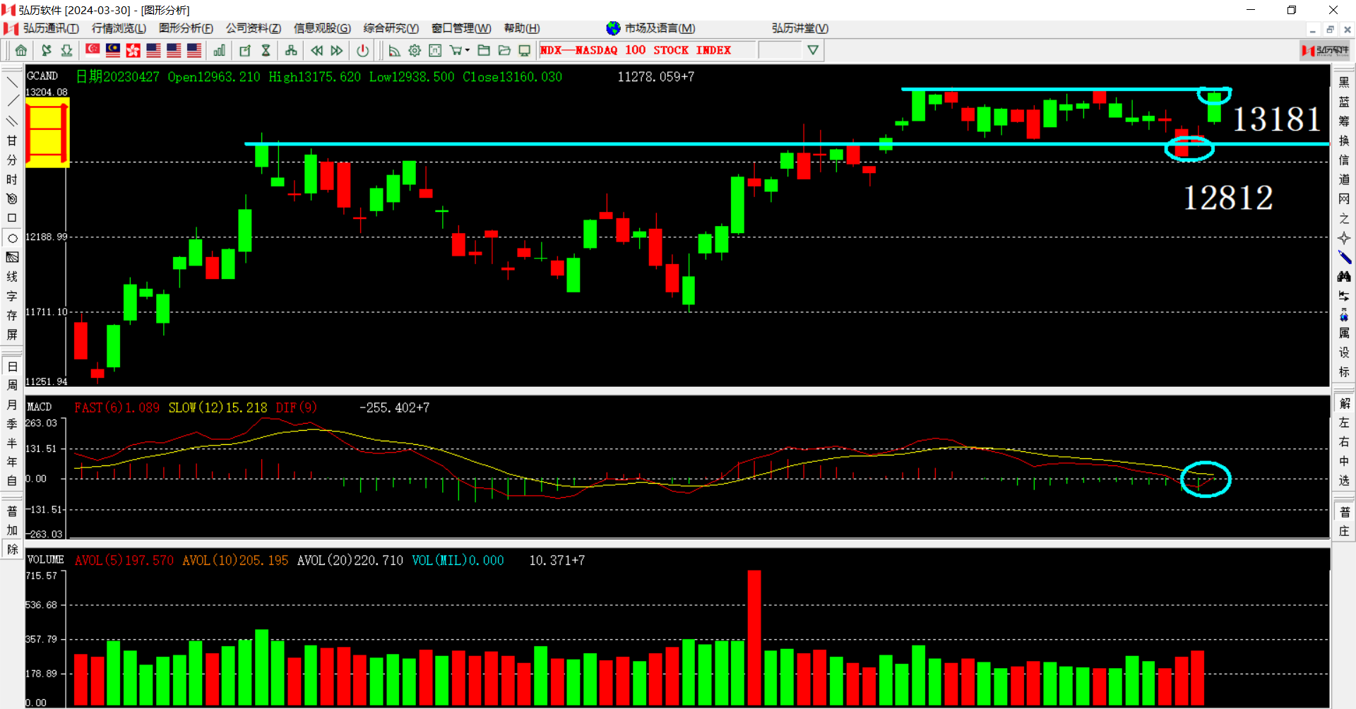 隔夜美股三大股指都出现大幅上升,主要受益于主要大型科技股超强财报利好影响,不过美国一季度GDP成长1.1%,大幅低于预期,这一利空相信会随着财报利好的落幕而反应在股价上,周三的收盘写到周二大跌后若能快速修复那还没有问题,周三反弹就回到了前期高点12812只上了,说明美股还是很强势,修复能力还很强,不过昨晚收盘又接近到了最新的高点阻力位13181附近,若今晚能再次突破就打开了上升空间,若不能够突破会继续震荡,从MACD的快线来看向上勾头又要回到0轴以上。