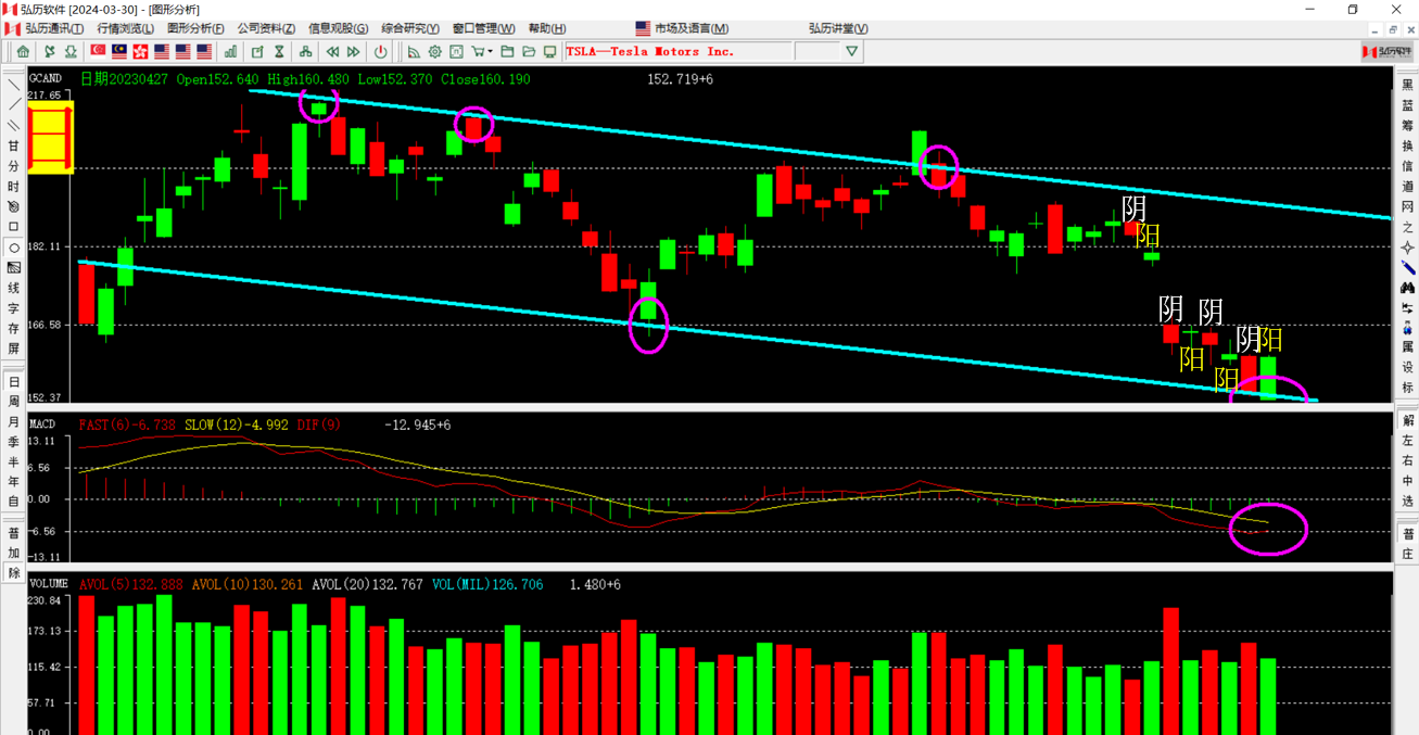 虽然特斯拉没有什么利好,但是受益于其他大型科技股的财报利好也涨的不错,按照技术分析的角度来看还是在遵循阴阳相隔出现的规则,只是之前都是假阳,昨晚收了真阳,这是一个好的信号,周三的大阴线也刚好达到了预测的目标位153附近(通道线下线),按照既有运行规则今晚应该收一个阴线,但是这个规则不会一直重复,因为昨天收了真阳,再收阴的概率降低,所以今晚若又收阳就是止跌信号。