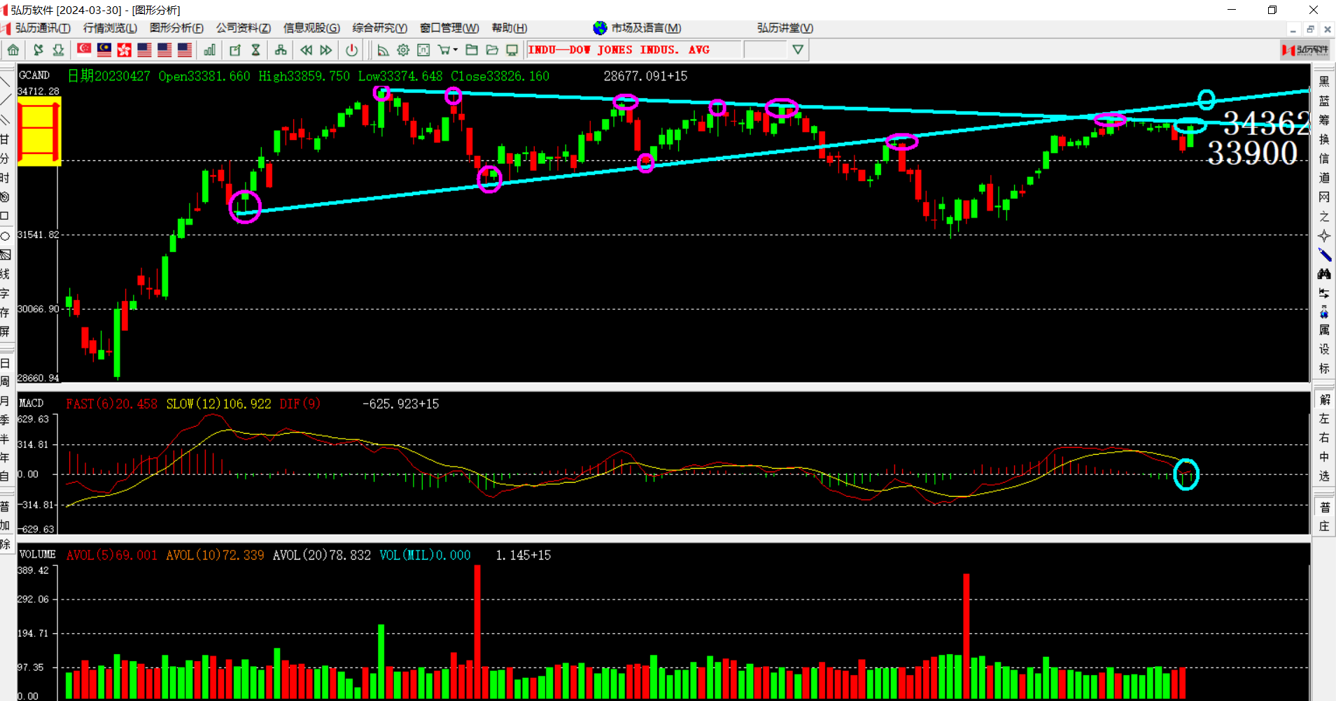 道指工业指数修复能力也是非常强的,经过两天大跌后昨晚高开高走,收盘吞吃了两天的阴线,不过又到了之前我们画的那条重要的反压线附近,我们今晚或下周还是要注意33900点是否能突破,突破了上升空间就打开了,会继续震荡下跌,突破之后还有第二阻力位是上升趋势线的位置34362,突破此位才可能形成长期的上升牛市。