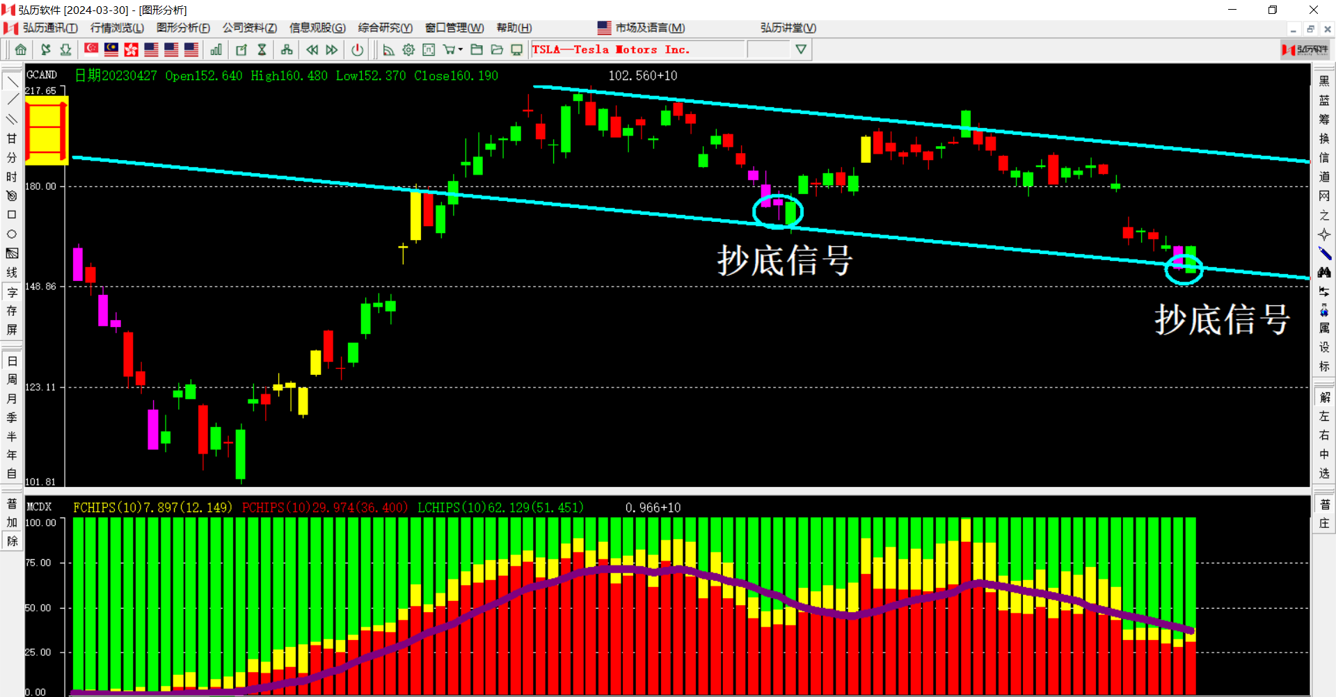 特斯拉,从中期的角度来看还在下降趋势,不过出现了紫色的抄底信号,若出现一个紫色就小时收阳开始上升,说明还在强势阶段,今晚再起就是中期止跌信号