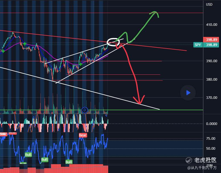 说一下我对SPY/SPX的看法,首先,如果市场走牛,我预计价格将会突破400点,然后会回测到400点,之后上涨到405、416和426点。然而,如果市场走熊,我认为价格将会下跌到390、382、379和366点。我还注意到,SPY熊市成交量非常高,而今天的行情是在较小的成交量下出现的,所以我认为市场可能会出现下跌。在这种情况下,我建议慎重考虑交易,因为交易可能非常棘手。另外,我还要提到,VIX指数已经大幅下降,但我认为市场可能会出现变化,所以我暂时不会进入交易。对于任何有兴趣进行交易的人,我建议保持警惕,谨慎决策,并遵循自己的交易策略。