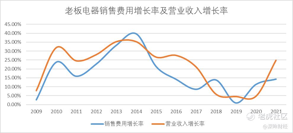 以老板电器为例,从每年的营收增长率和销售费用增长率对比图可以看出,二者的走势基本一致。