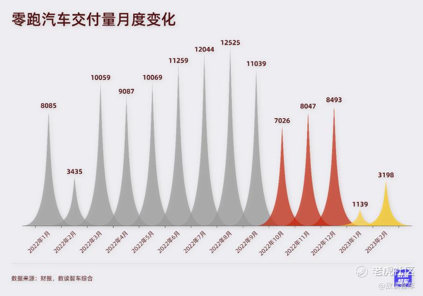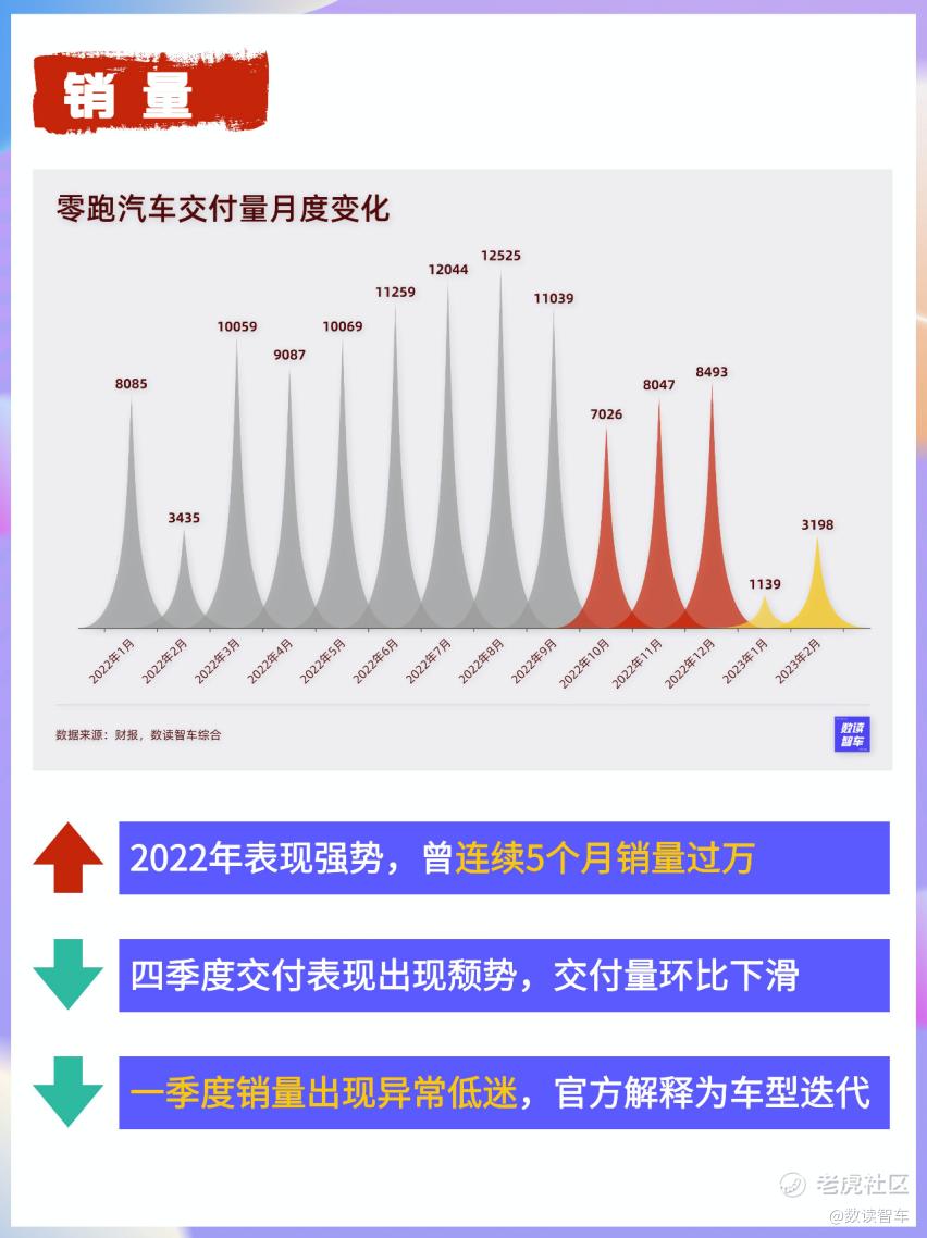 更为扎眼的是今年1月,零跑只交出了1139辆的惨淡成绩单。2月也只有3198辆。在财报中,零跑表示,公司在进行车型迭代,主要完成了2023款车型的SOP及产线导入。