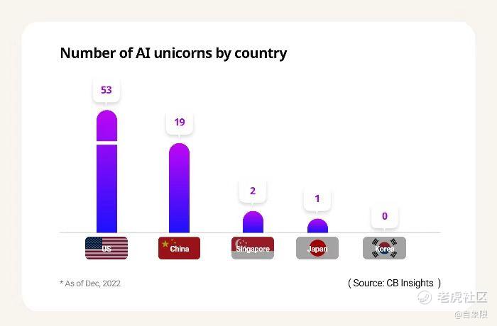 根据全球科技市场追踪机构 CB Insights 的数据,截至 2022 年 12 月,美国的 AI 独角兽数量最多,有 53 家初创公司。中国以 19 家位居第二,其次是英国有4家,但韩国却没有AI独角兽公司,而即使是国内生产总值 (GDP) 低于韩国的以色列也有 3 家。