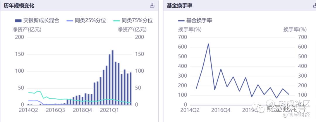 那么,是什么原因导致王崇的业绩出现下降?我们先看看王崇旗下规模最大的交银新成长混合,该基金成立于2014年5月9日,基金经理是王崇,截至2022年12月31日基金规模为97.91亿元。虽然近年来该基金业绩有所回升,但基金的规模一直在下降,2021年2季度还有163.34亿元,到了2022年四季度仅有97.91亿元,也相当于6个月下降了65.43亿元。