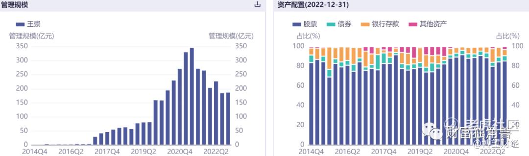 由于业绩大幅回落,近年来王崇所管理的基金规模一直在下降,自2021年2季度王崇管理的基金规模上冲至347.50亿元后就一路开启下降模式,截至2022年4季度规模已经降至188.48亿元,相较于2021年2季度已经下降159.02亿元,这也暗示着,这六个季度来王崇的基金规模一直在下降。