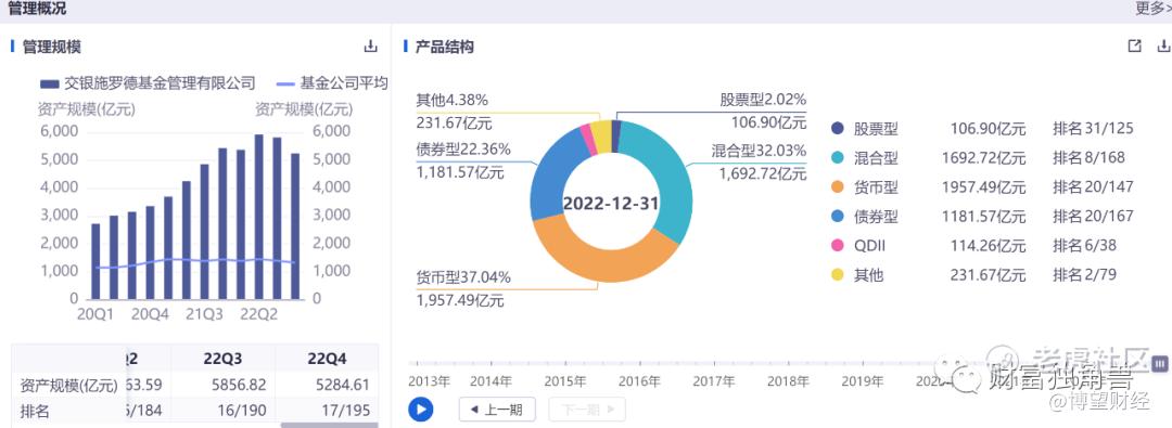 据官网显示,交银施罗德是中国第一批银行背景基金公司之一,自2016年四季度基金规模突破1000亿元之后,交银施罗德基金的规模持续增长,一直到2022年二季度的5963.59亿元后,整体基金规模出现下降,截至2022年12月31日基金规模回落至5284.61亿元,相较于去年二季度下降了678.98亿元。