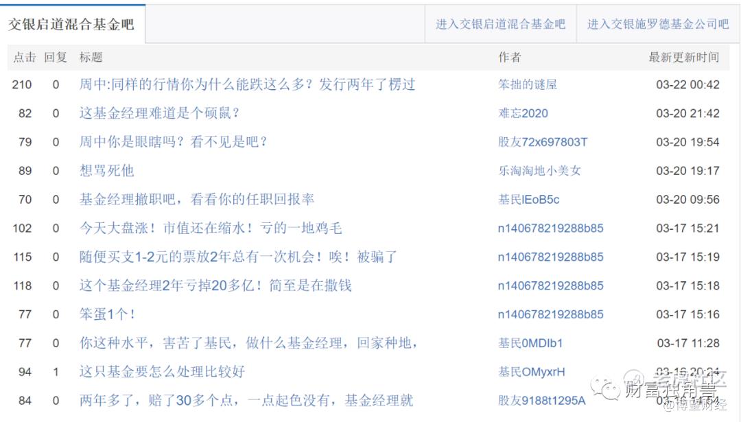 业绩持续下滑,自然引发基民的抱怨,有基民表示,全部高位接盘,交银基金整体差的不是一般,拿着那么高的佣金亏不亏心。也有基民称,前任把自己搞抑郁了,这任把基民搞抑郁了,真行啊!另有基民表示,持基2年,亏18%,认栽,今天撤了,不再碰此基。看到基民的抱怨,突然想起某财经媒体的一个标题:交银施罗德基金到底怎么了?