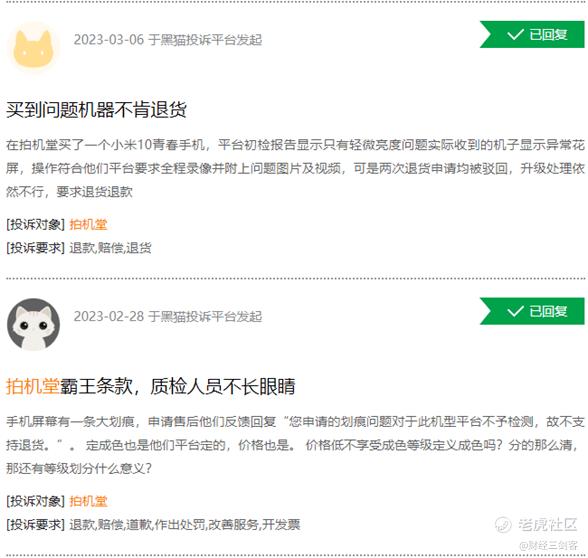 有网友甚至直言,拍机堂成了“坑人堂”。2月19日,有网友在黑猫平台发帖反映:“一部屏幕明显色斑的机器,因为后盖有胶,我用刀片清了下缝隙胶,被告知质检不合规。你们睁眼说瞎话的程度已经到了这种程度吗?”