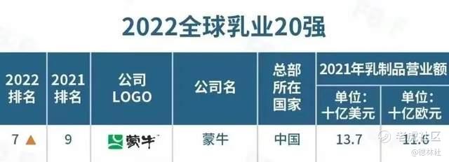 权威机构荷兰合作银行公布的2022年全球乳业20强排行榜中,蒙牛排名上升2位,排名第7,成为了中国实现排名上升的乳企。