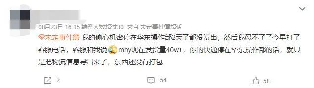 就在一周之前,一位米哈游旗下《未定事件簿》的玩家在超话下发博抱怨称,自己购买的周边在快递公司的华东操作部停留了2天还没发出,不耐其烦的她拨打了客服电话,客服表示目前米哈游竟有高达40万+的快递待发出,因此如果快递信息显示停留在华东操作部,也只是把物流信息导出而已,实际上商品还未打包。