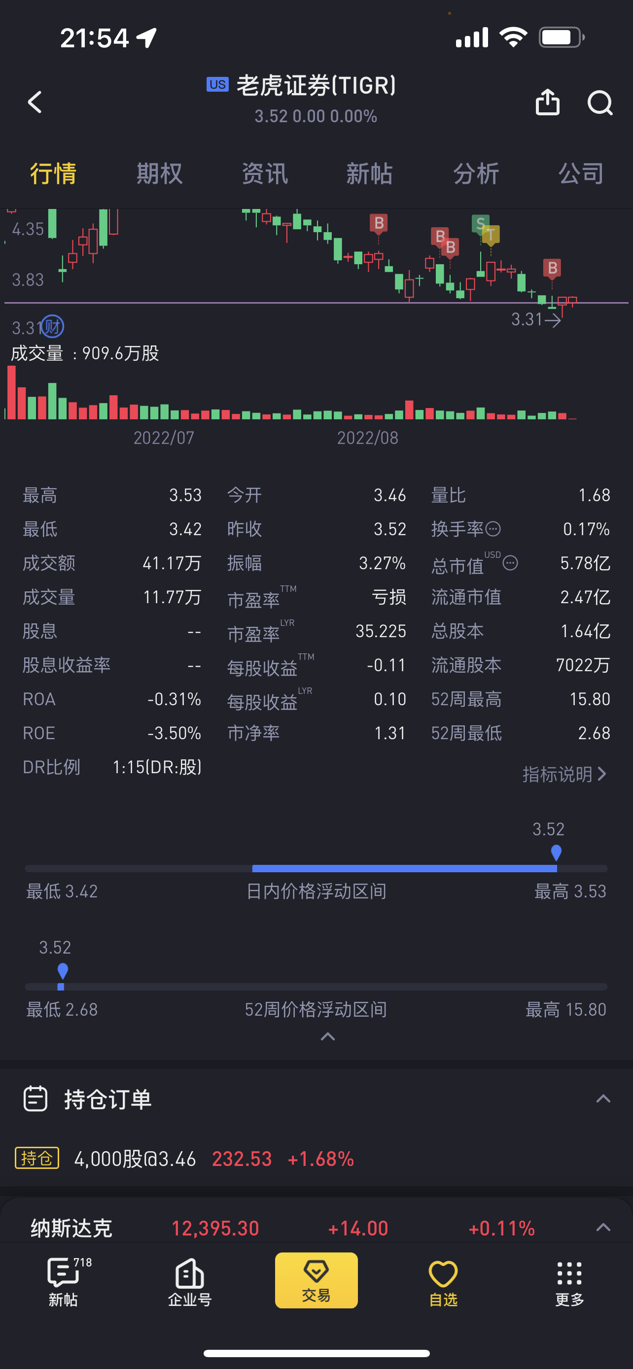 今天第三天,虽然开盘价3.46美元,一度下探到3.42美元,但随即转跌为涨,截至目前到3.6美元,+2.27%。