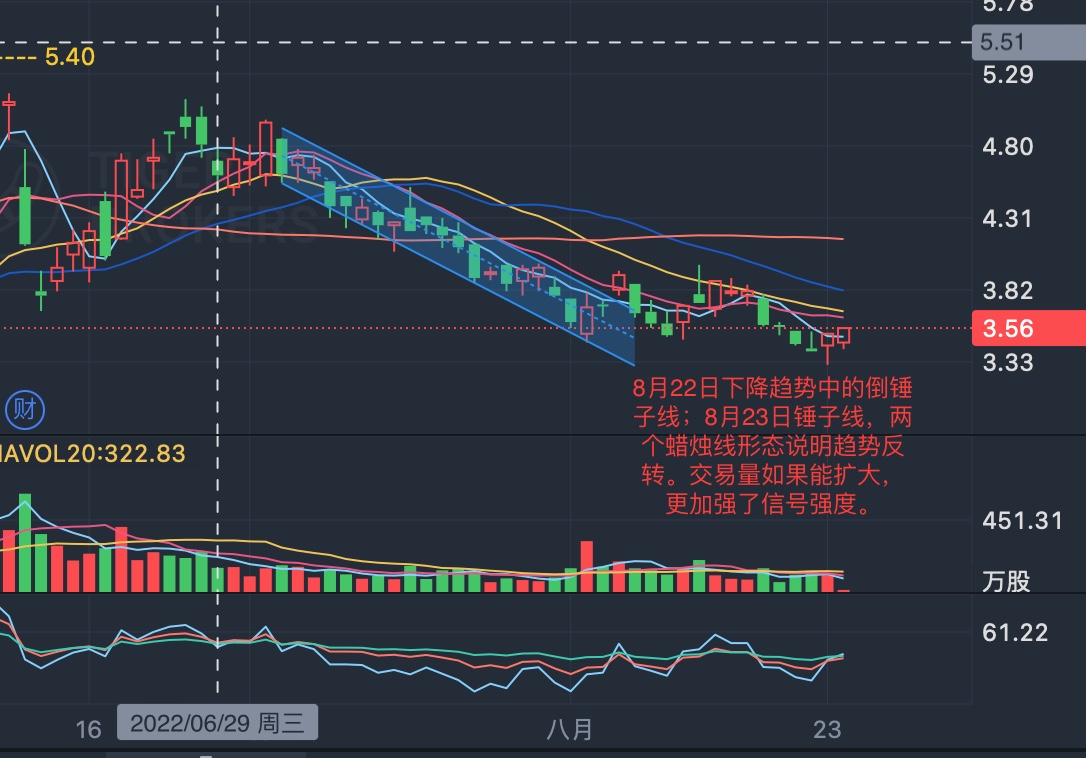 第二天,8月23日在纳斯达克大盘下跌走弱的大环境下,又收获一个锤子线形态,虽然下探到3.31美元,但收盘价与当日最高价持平,达到3.52美元,进一步夯实了多方力量的强大。