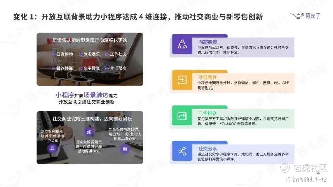 从内部连接、外链跳转、广告推送、社交分享四个维度,开放赋予小程序更加强劲的场景触达能力,为社交商业与新零售的创新提供新基建。