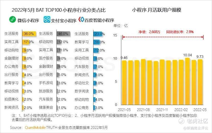 据QuestMobile发布的《2022全景生态流量半年报告》显示,小程序发展愈加成熟,BAT三大小程序总体去重用户规模峰值已突破10亿大关,成为重要流量渠道。