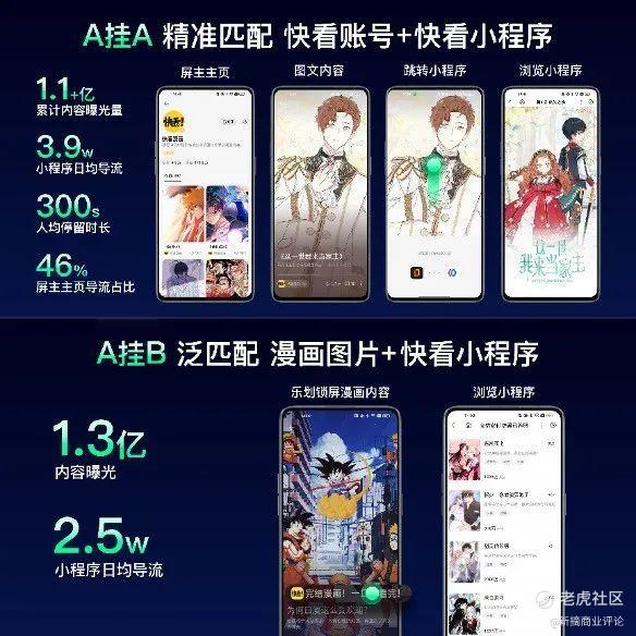 以乐划锁屏与快看漫画的合作为例,在用户的使用过程中可以实现“快看账号+快看⼩程序”的精准匹配,以及“漫画图⽚+快看⼩程序”的泛匹配。据悉,该创新玩法在两种匹配模式下,都为快看小程序带来了日均数万的导流,以及累计超过1亿的内容曝光量。