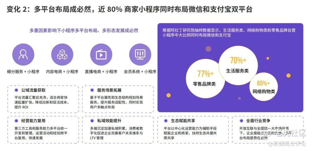 随着竞争压力的不断增大,在多个平台布局小程序更有利于商家扩大获取公域流量、拓展服务场景和经营能力复用,在平台赋能生态共享的环境中达成降本提效的经营目标。