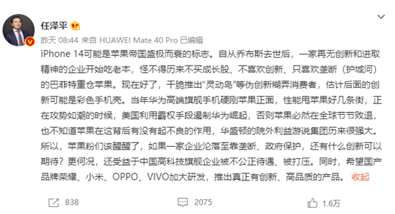 9月20日,经济学家任泽平发了条微博,评价苹果再无创新和进取精神,直指“灵动岛”是伪创新:“iPhone 14可能是苹果帝国盛极而衰的标志。”2022年苹果秋季发布会上,最引人关注的就是苹果终于放弃了祖传“丑刘海”,取而代之的是“灵动岛”设计。