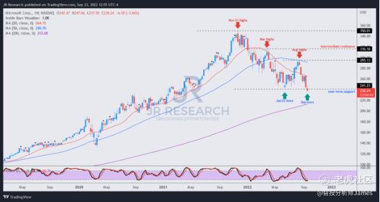 微软仍处于中期下行趋势,其8月高点形成近期阻力区。不过,投资者应该注意到,微软的长期上行倾向仍未改变。因此,投资者需要评估他们是否预计6月份的低点将保持强劲,尽管最近出现了大幅回调。