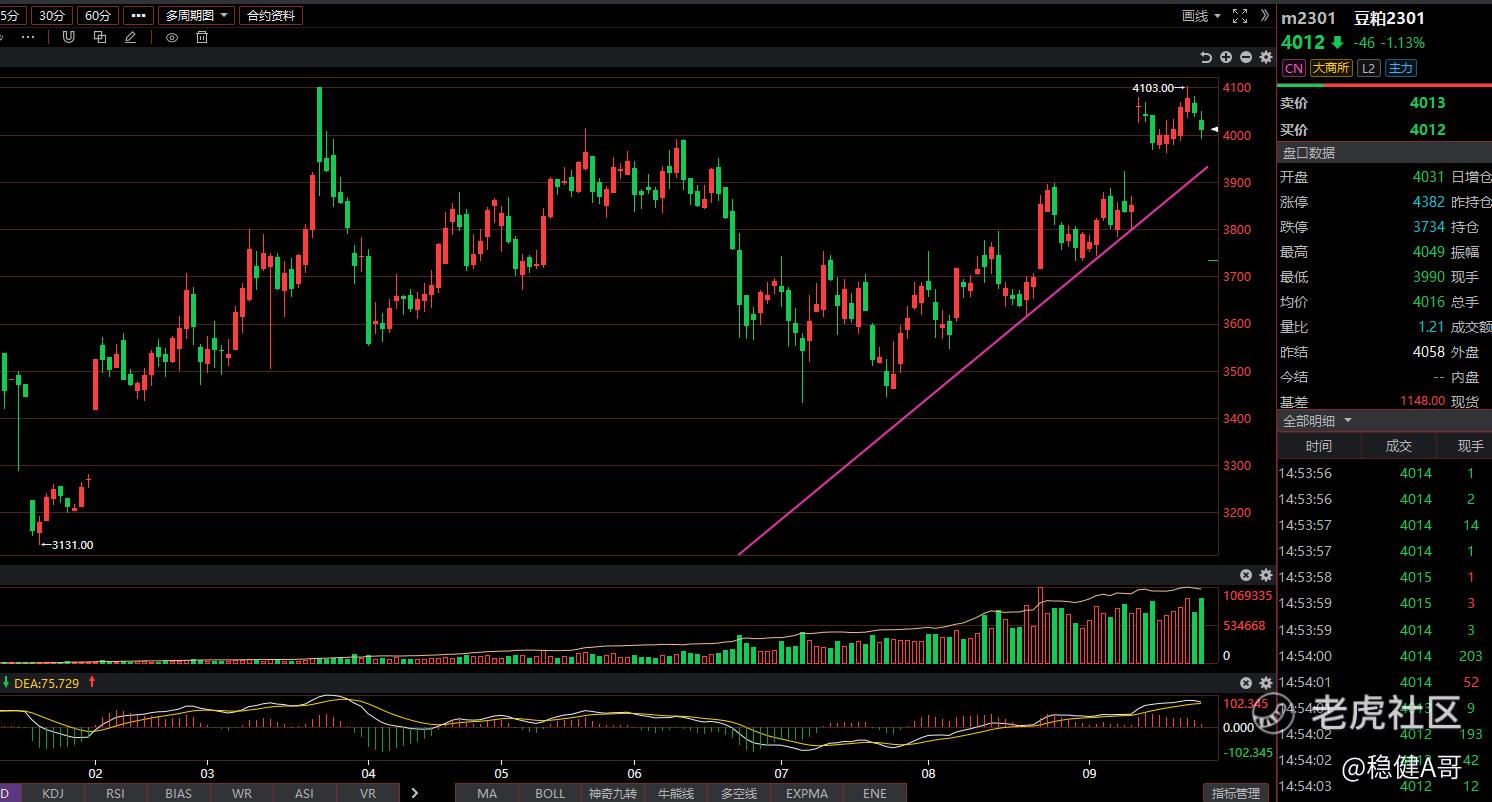 上图是豆粕日线走势分析:短期如果明天继续收阴的话,就要试探3900了,其实技术面来看上涨的概率是大于跌的概率的,但是结合现货方卖弄豆粕价格过高,国家调控加上猪肉下跌,养猪企业对于豆粕需求减少,基本面下跌的概率是大于技术面!