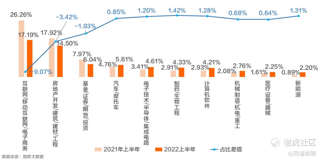 受大环境影响,互联网/移动互联网行业热潮退去,投递该行业的青年人才占比下滑最多,下跌了 9.07 个百分点;投递房地产、基金/证券业的青年人才占比也有所下降。相比之下,投递汽车、电子技术/半导体、制药/生物工程、机械制造/重工、新能源产业等国家大力倡导的实体产业的青年人数占比出现不同幅度的增长,其中,制药/生物工程、新能源增幅最大,2022 上半年比去年同期上升了 1.42、1.31 个百分点。