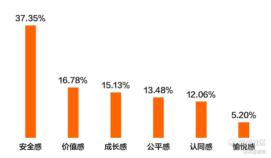 在猎聘调研中,当问起职场人对工作最强烈的诉求时,安全感高居首位,比例达37.35%;其次是价值感和成长感,占比为16.78%和15.13%。可见职场人对工作的考量要在满足安全感的前提下,兼顾价值感和成长感。