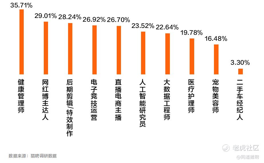 以直播行业为主的新兴行业的崛起丰富了当代大学生的就业选择,主播、后期剪辑、自媒体 UP 主、健康管理师、宠物美容师等新职业不断涌现,逐渐改变着大学生的就业观念,大学生择业观更趋向多元和务实,注重另辟蹊径提升就业竞争力。猎聘调研发现,健康管理师、网红博主达人成为应届生最想从事的两大新职业,得票率分别为 35.71%、29.01%。